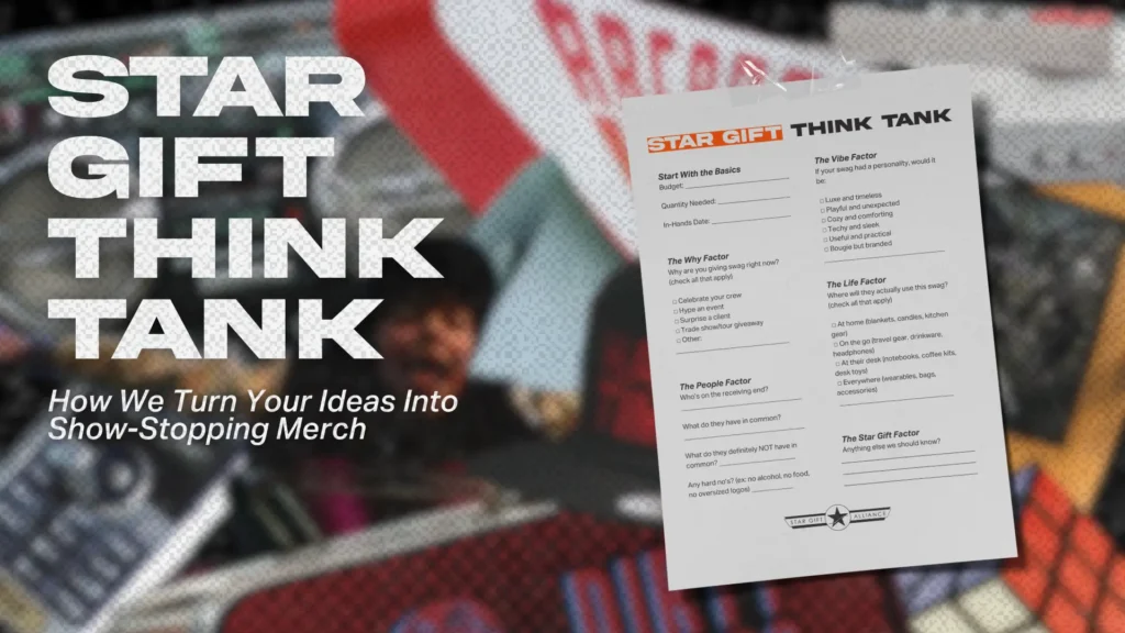 The Swag Think Tank isn’t just a “pick from a catalog” kind of thing. It’s where your wild ideas meet our “we can totally make that happen” expertise. Answer these prompts with as much (or as little) detail as you like, and we’ll turn your thoughts into show-stopping swag.